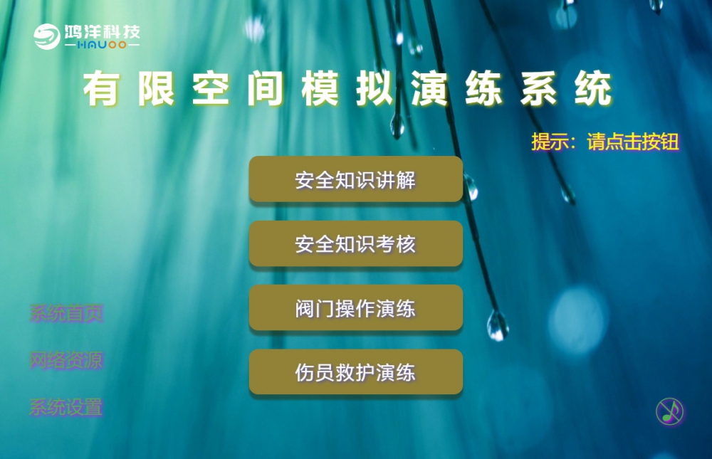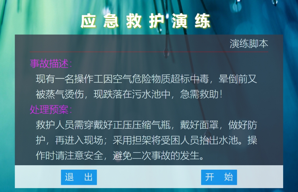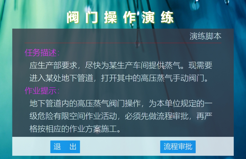 有限空間模擬演練系統現有有限空間內閥門操作演練、傷員救護演練等兩種演練腳本;可完整演練有限空間閥門安全操作與傷員救護的全部規范流程。