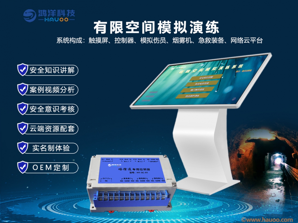 有限空間模擬演練系統的組成部件包括:觸摸屏、觸摸屏用多媒體軟件、控制器、演練裝備(氣體檢測儀、壓縮氣瓶、防護面罩、擔架、安全繩、模擬傷員等)、演練設備(閥門、煙霧發生器、警報、清洗平臺等)、裝飾燈、云端配套服務、配電箱、模擬有限空間等。